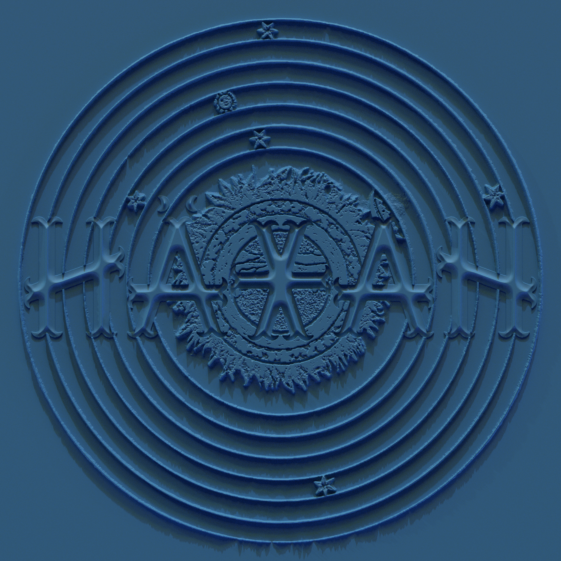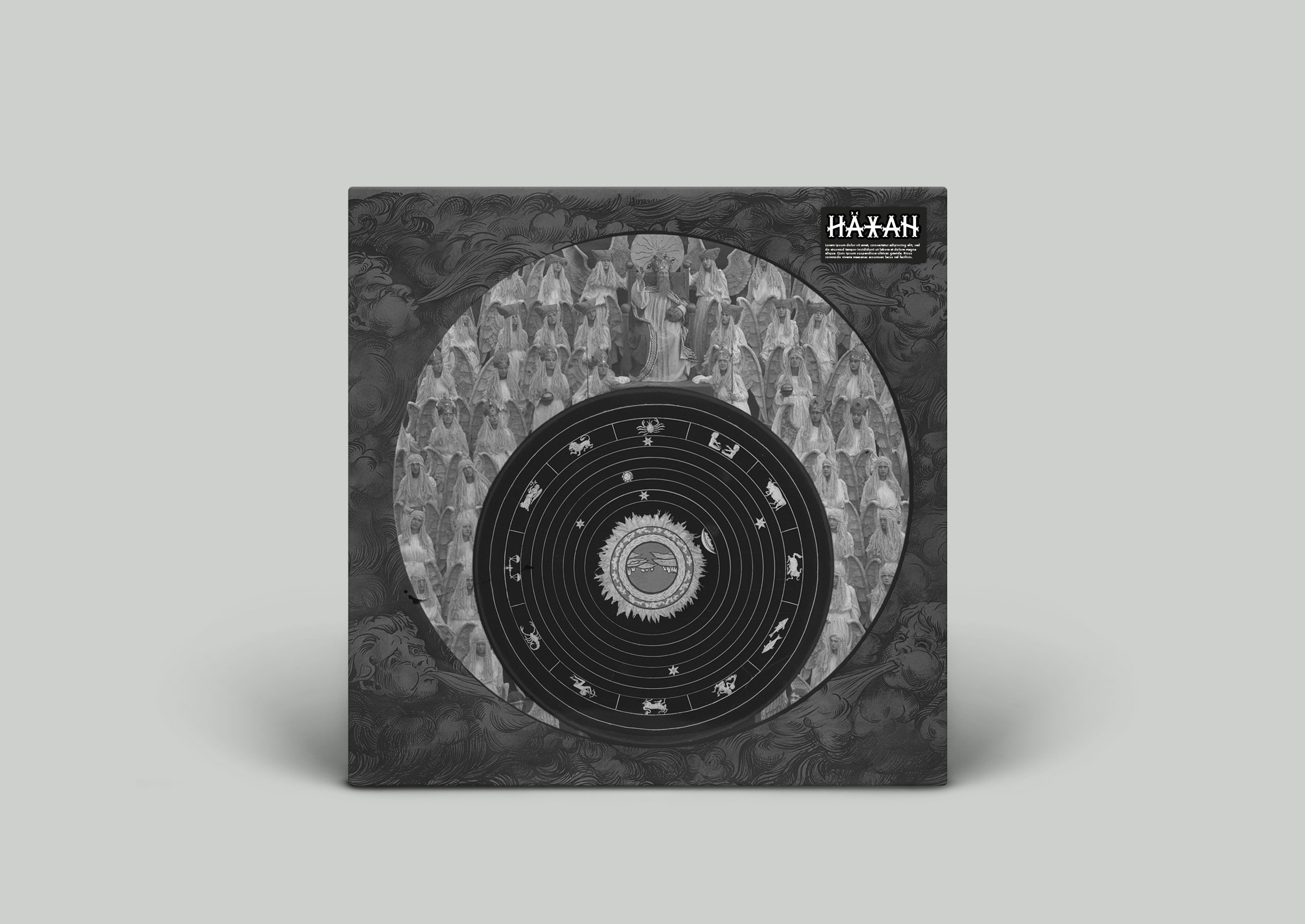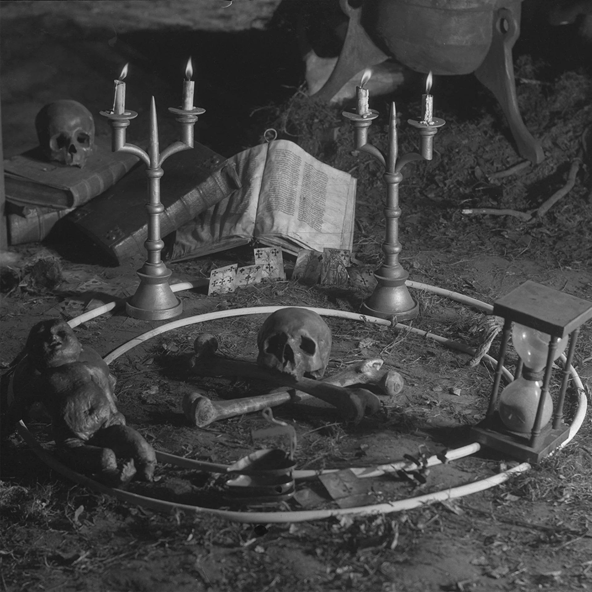 Taken from the film, the artwork sums up the principle of satanic ritual and creates a duality between the baby personifying life on the left and the hourglass symbolizing time on the right. Death is in the center, while a book placed outside the circle evokes emancipation through knowledge.
